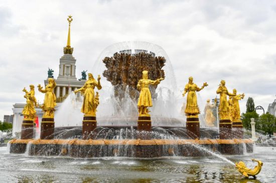 這是5月13日在俄羅斯首都莫斯科拍攝的國民經(jīng)濟成就展覽館的噴泉。新華社記者曹陽攝