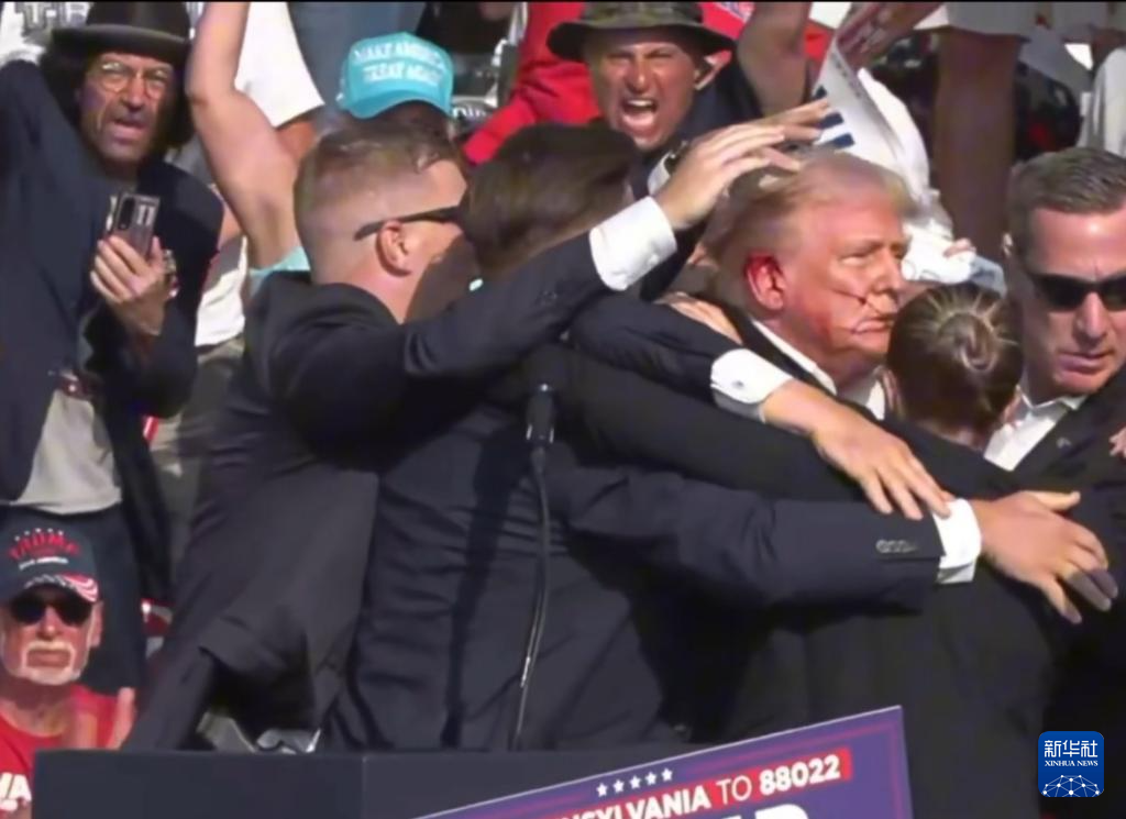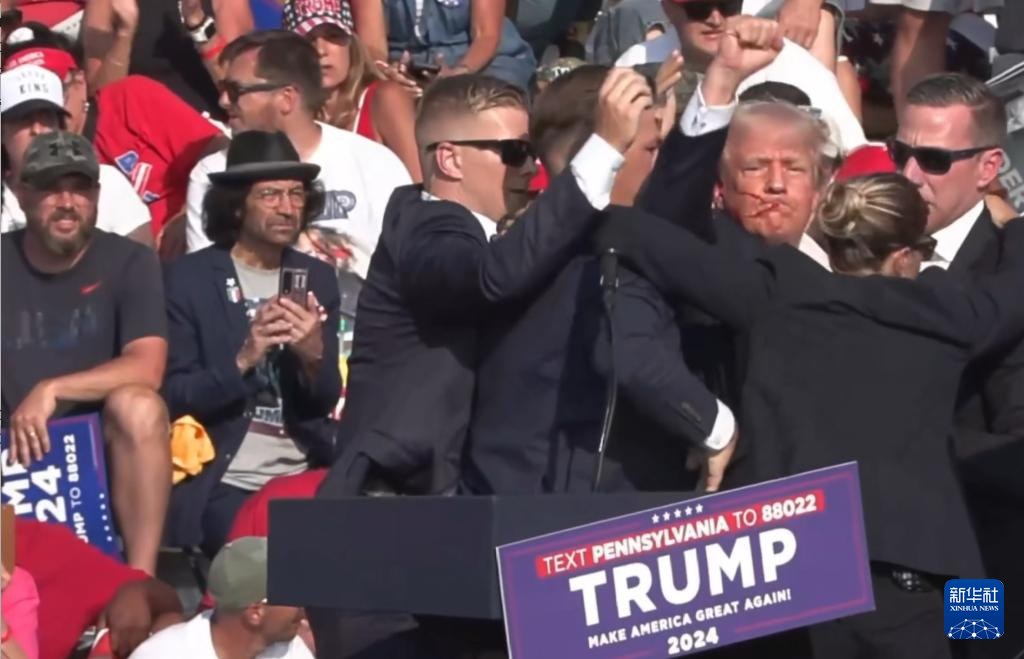 7月13日,美國(guó)前總統(tǒng)特朗普在賓夕法尼亞州巴特勒市的競(jìng)選集會(huì)現(xiàn)場(chǎng)被護(hù)送離開(kāi)。新華社/美聯(lián)