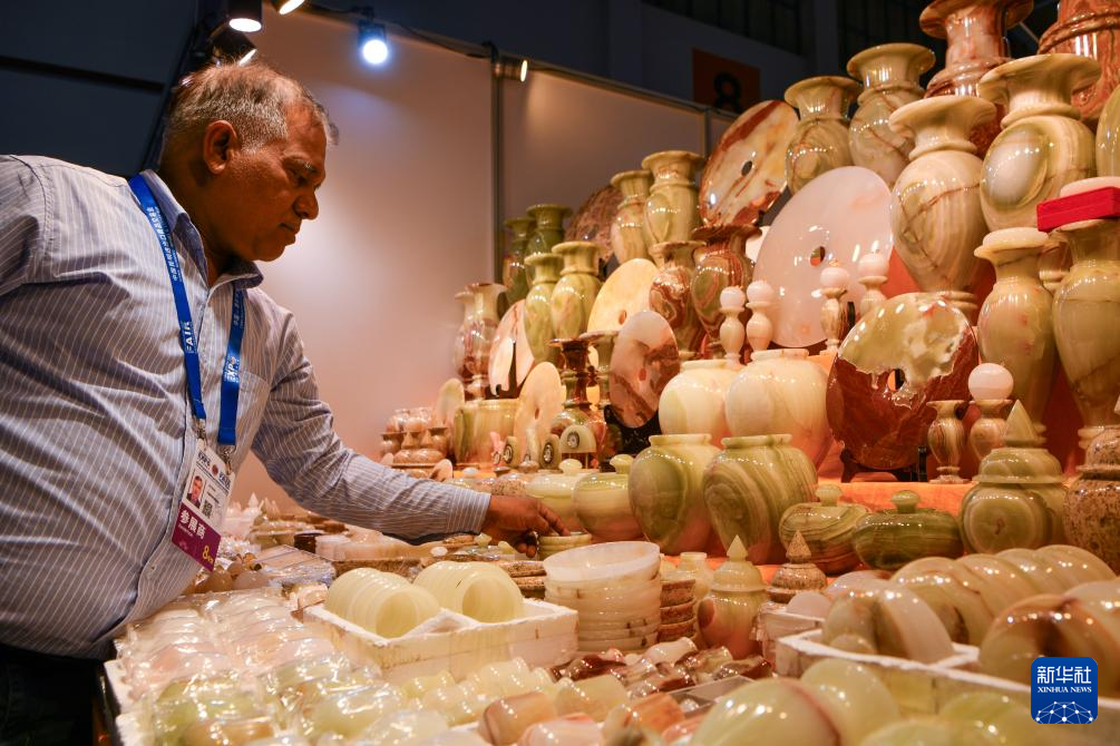 7月26日,巴基斯坦參展商在南博會(huì)南亞館整理展銷的工藝品。