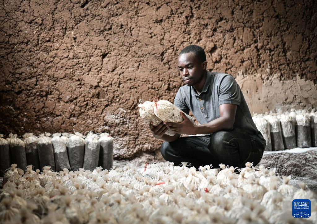8月14日,在盧旺達南方省穆漢加區(qū),尼揚博·奧貝德在食用菌培育工坊內(nèi)檢查菌袋。曾兩次赴中國進行菌草技術(shù)培訓(xùn)的尼揚博·奧貝德在南方省和東方省各擁有一家工坊。