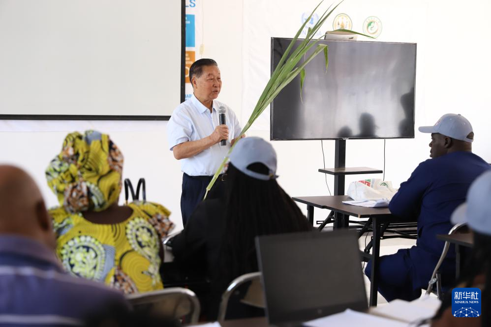 8月4日,在位于盧旺達(dá)南方省胡耶區(qū)的中國(guó)援盧農(nóng)業(yè)技術(shù)示范中心的教室,菌草發(fā)明人林占熺為培訓(xùn)班學(xué)員講解菌草技術(shù)。