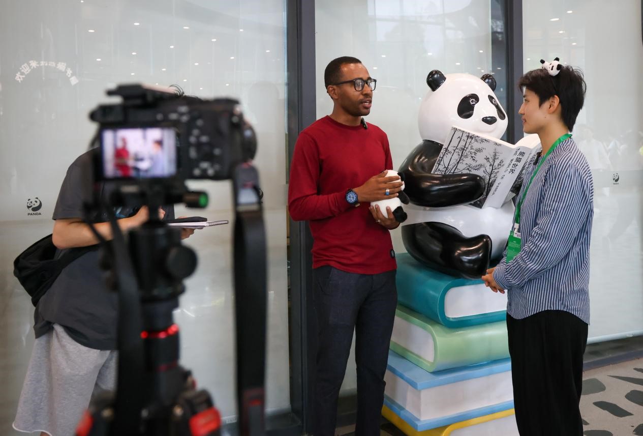 調(diào)研期間,坦桑尼亞桑給巴爾廣播電視臺的阿布巴卡爾在成都大熊貓繁育研究基地接受采訪。人民日報記者 伊霄攝