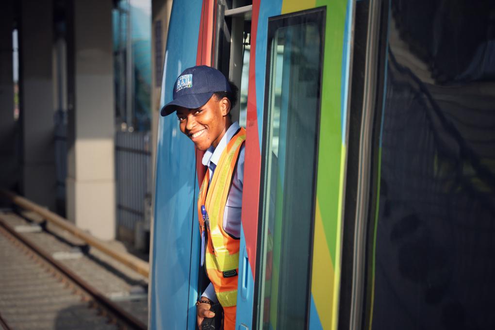 2024年6月12日,在尼日利亞拉各斯,拉各斯輕軌藍線項目動車組列車司機組長伊莎貝拉·亞當斯·伊斯拉埃爾與列車合影。新華社發(fā)(中土集團尼日利亞有限公司供圖)