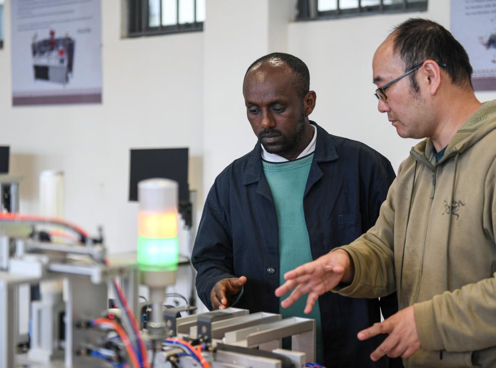 2024年2月15日,在亞的斯亞貝巴的埃塞俄比亞聯(lián)邦職業(yè)技術培訓學院,魯班工坊中方負責人江絳(右)與當?shù)亟處熂s納斯·阿凱萊(中文名艾友涵)交流教學內(nèi)容。新華社記者 李亞輝 攝