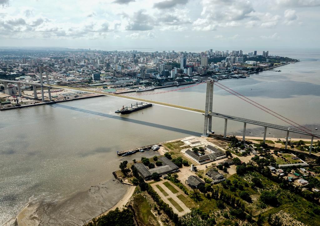 這是2019年4月8日在莫桑比克首都馬普托拍攝的馬普托大橋(無人機照片)。 新華社記者 張宇 攝