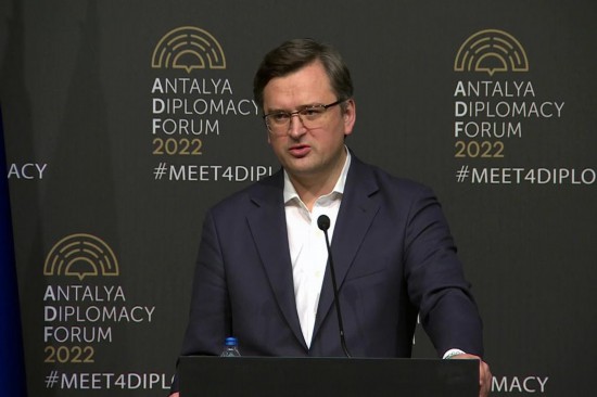 2022年3月10日,烏克蘭時任外長庫列巴在與俄羅斯外長拉夫羅夫(未在畫面中)會談后召開新聞發(fā)布會。新華社發(fā)