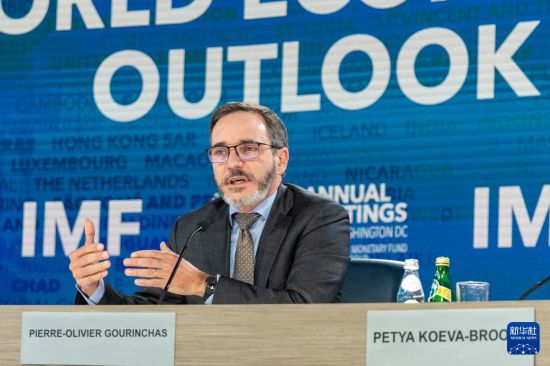 10月22日,在美國(guó)華盛頓,國(guó)際貨幣基金組織(IMF)首席經(jīng)濟(jì)學(xué)家皮埃爾-奧利維耶·古蘭沙在《世界經(jīng)濟(jì)展望報(bào)告》媒體發(fā)布會(huì)上講話。新華社記者 胡友松 攝
