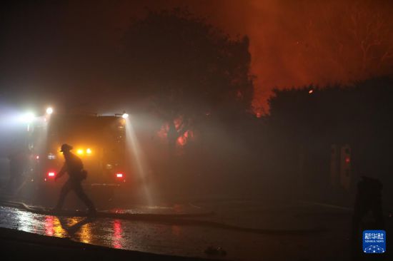 1月7日,在美國(guó)加利福尼亞州南部洛杉磯縣沿海社區(qū)帕西菲克帕利塞茲,消防員奮戰(zhàn)在野火現(xiàn)場(chǎng)。