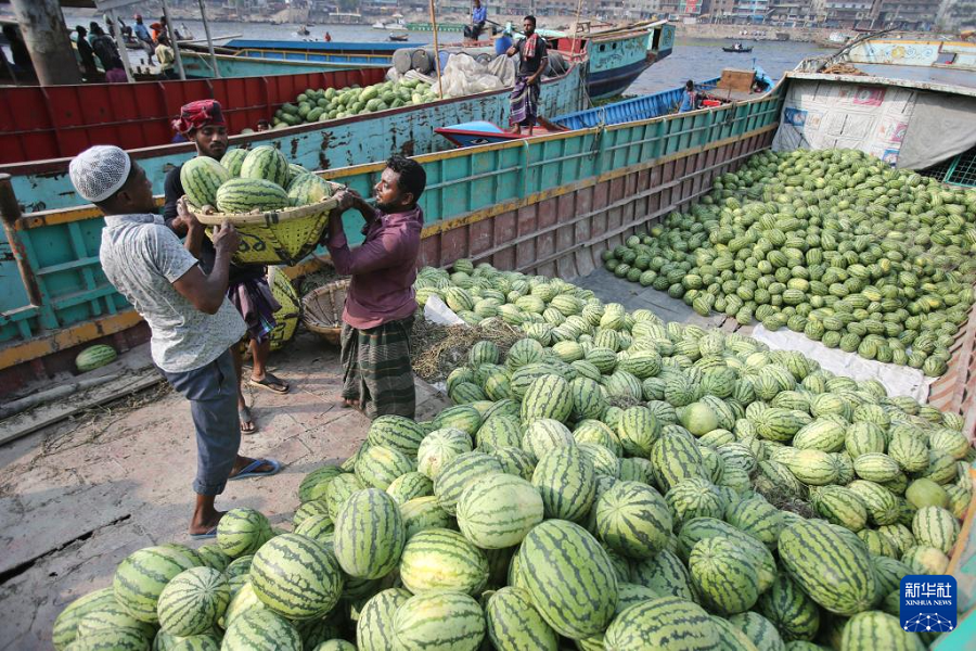3月16日,在孟加拉國達卡的薩達爾加特輪渡碼頭,工人們在船上搬運運往當?shù)厥袌龅奈鞴稀?/p>