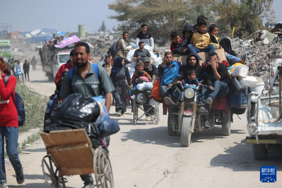 3月18日,被迫逃離加沙地帶北部拜特哈嫩的巴勒斯坦民眾經(jīng)過加沙城。
