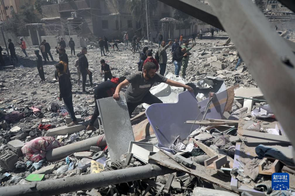 3月19日,在加沙地帶北部加沙城的一處社區(qū),人們在以軍襲擊后的廢墟中搜尋。