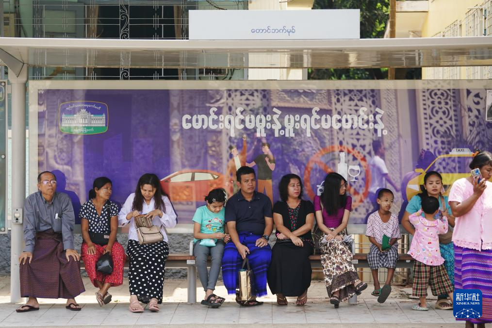 3月30日,市民在緬甸仰光的一處公交站等候公交車。