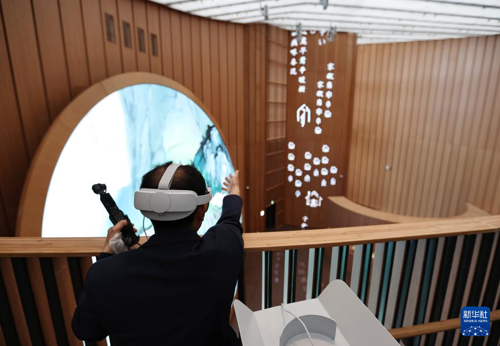 4月13日,在日本大阪,參觀者在中國館內(nèi)體驗MR(混合現(xiàn)實)眼鏡。