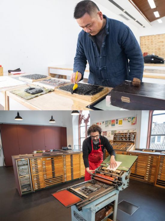 拼版照片:上圖為4月2日,膠泥活字非遺傳承人汪奎展示覆墨工藝。新華社記者肖藝九攝;下圖為3月21日,古登堡博物館印刷車間經(jīng)理克里斯托夫·松德爾展示古登堡印刷術工藝。新華社記者張帆攝