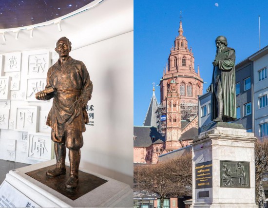 拼版照片:左圖為4月2日在湖北省英山縣畢昇紀念園拍攝的畢昇塑像。新華社記者肖藝九攝;右圖為4月7日在德國美因茨拍攝的古登堡雕塑。新華社記者張帆攝