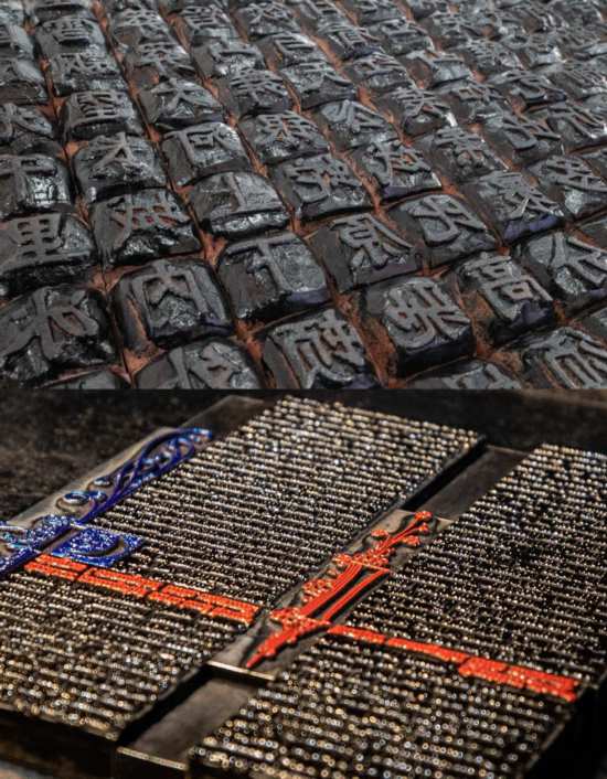 拼版照片:上圖為4月2日在湖北省英山縣畢昇紀念園拍攝的泥活字。新華社記者肖藝九攝;下圖為3月21日在古登堡博物館拍攝的傳統(tǒng)古登堡印刷術雕版。新華社記者張帆攝
