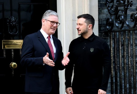 3月1日,在英國倫敦唐寧街10號首相府前,英國首相斯塔默(左)與烏克蘭總統(tǒng)澤連斯基交談。新華社記者 李穎 攝