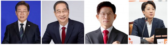 2025年韓國(guó)總統(tǒng)選舉有力競(jìng)爭(zhēng)者(從左至右):李在明、韓德洙、金文洙、李俊錫。圖源:各候選人所屬政黨官方網(wǎng)站及個(gè)人社交媒體官方賬號(hào)