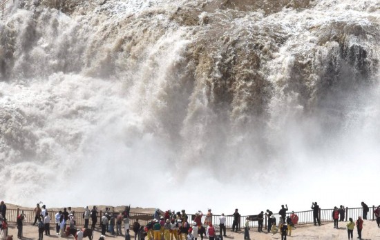2025年4月9日,游客在山西吉縣黃河壺口瀑布景區(qū)欣賞壯美的“桃花汛”。新華社發(fā)(呂桂明攝)