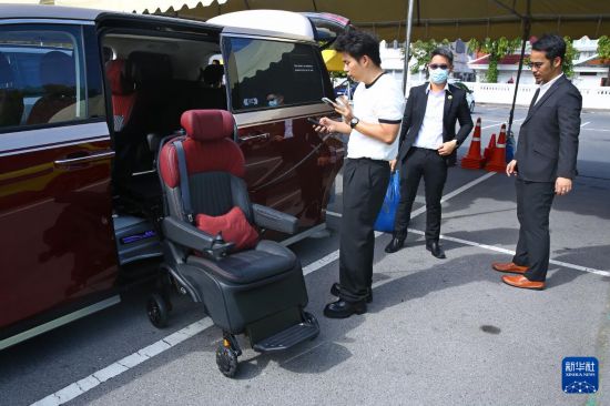 6月4日,在泰國曼谷舉辦的道路安全周活動上,工作人員展示廣汽傳祺M8 PHEV上搭載的輪椅。新華社記者 孫瑋彤 攝