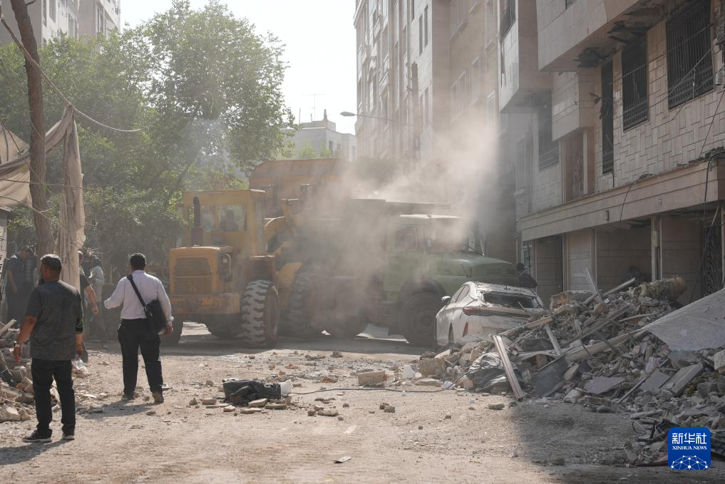 6月13日,在伊朗首都德黑蘭,工程車輛清理在以軍襲擊中受損的建筑。