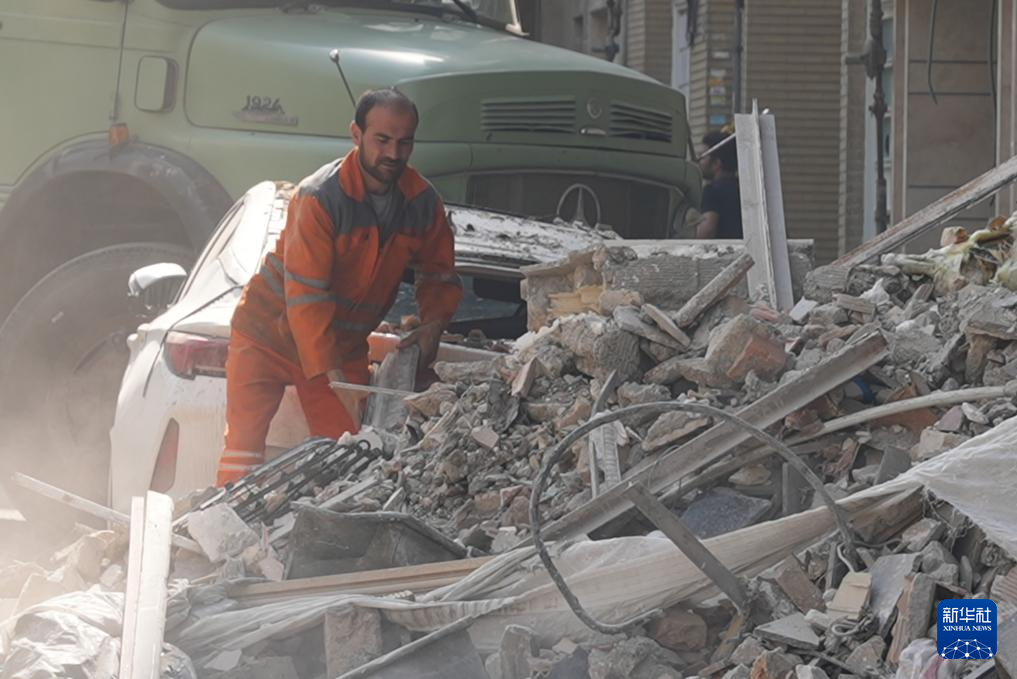 6月13日,在伊朗首都德黑蘭,救援人員清理在以軍襲擊中受損的建筑。