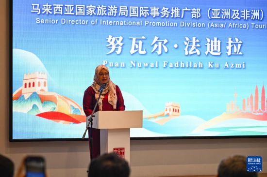 7月7日,在馬來西亞吉隆坡,馬來西亞國家旅游局國際事務推廣部(亞洲及非洲)高級總監(jiān)法迪拉在活動上致辭。新華社記者 程一恒 攝