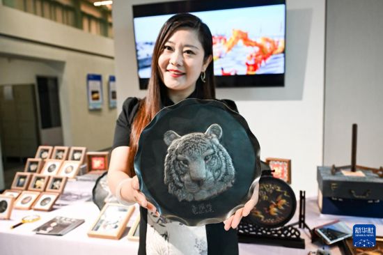 7月7日,在馬來西亞吉隆坡,河北省非物質文化遺產(chǎn)郭氏鐵板浮雕藝術傳承人郭墨涵展示她的作品。新華社記者 程一恒 攝