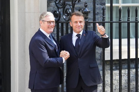 7月10日,在英國倫敦唐寧街10號首相府前,英國首相斯塔默(左)與法國總統(tǒng)馬克龍握手。新華社記者 吳魯 攝