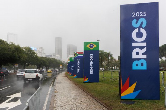 這是7月3日在巴西里約熱內(nèi)盧拍攝的金磚國家領(lǐng)導(dǎo)人第十七次會晤歡迎標(biāo)語牌。新華社發(fā)(克勞迪婭·馬爾提尼攝)
