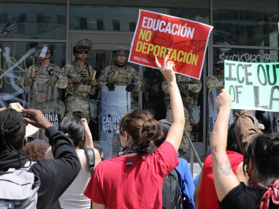 6月9日,在美國加利福尼亞州洛杉磯一處聯(lián)邦機構(gòu)建筑外,示威者與國民警衛(wèi)隊人員對峙,抗議特朗普政府大肆抓捕非法移民和調(diào)遣國民警衛(wèi)隊進(jìn)駐洛杉磯地區(qū)。新華社發(fā)(邱晨攝)