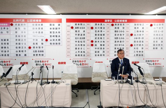 7月20日,在日本東京自民黨總部,石破茂為當(dāng)選議員貼花。新華社發(fā)(Pool圖片,弗蘭克·羅比雄攝)