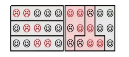 上圖是個(gè)簡化的例子,通過不同的區(qū)域劃分,黑方在左圖的每個(gè)區(qū)域中都占據(jù)多數(shù),對(duì)紅方取得了3:0的優(yōu)勢。但按右圖的方式劃分,紅方反而取得了2:1的領(lǐng)先。