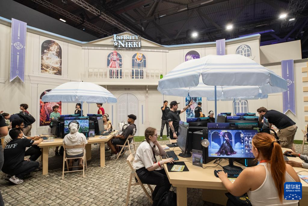 8月21日,在德國(guó)科隆,參觀者在科隆游戲展疊紙游戲展臺(tái)試玩游戲《無(wú)限暖暖》。