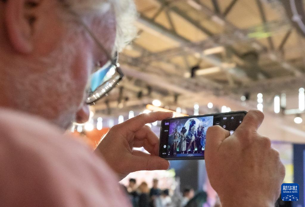 8月21日,在德國(guó)科隆,一名參觀者在科隆游戲展米哈游展臺(tái)拍攝游戲角色扮演者。