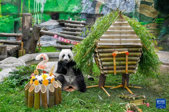8月24日,大熊貓“喀秋莎”在俄羅斯莫斯科動物園享用“生日蛋糕”。