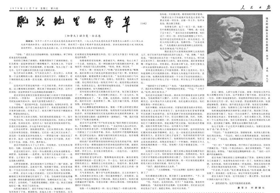 1979年11月7日,在白求恩逝世40周年之際,《人民日?qǐng)?bào)》第六版以《肥沃地里的野草》為題刊載了這篇小說(shuō),作為對(duì)這位偉大的國(guó)際主義戰(zhàn)士的深切紀(jì)念。