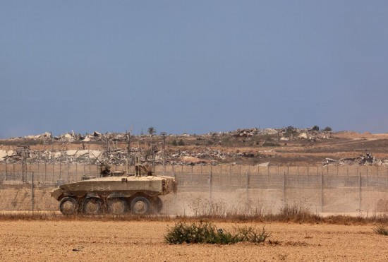 這是8月28日從加沙邊境以色列一側(cè)拍攝的以軍裝甲車。新華社發(fā)(吉爾·科恩·馬根攝)