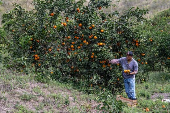 8月19日,在巴西里約熱內(nèi)盧州坦瓜市,一名橙農(nóng)采摘橙子。每年8月至9月,巴西各地橙園進(jìn)入收獲季節(jié)。巴西是全球最大的橙汁生產(chǎn)國和出口國之一,在國際市場上占有重要地位,其產(chǎn)品遠(yuǎn)銷世界各地。新華社記者王天聰攝