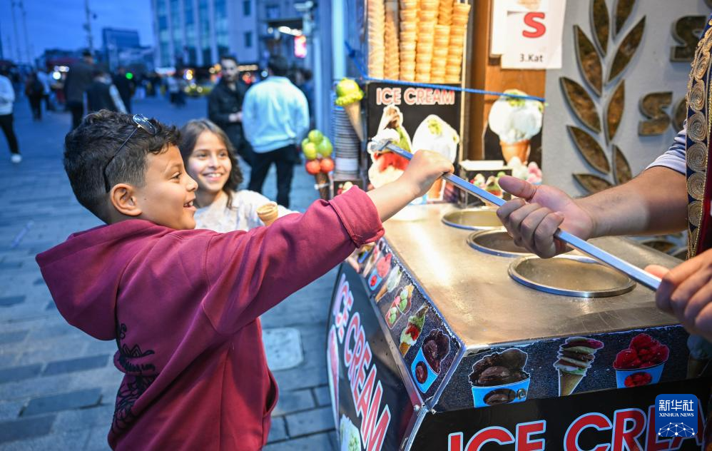 11月19日,兩名兒童在伊斯坦布爾獨立大街上體驗土耳其冰激凌戲法。