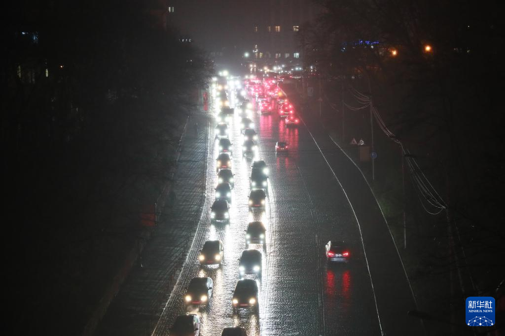 11月20日,烏克蘭首都基輔主要街道的照明設(shè)施出現(xiàn)大面積停電,車輛在夜色中行駛。